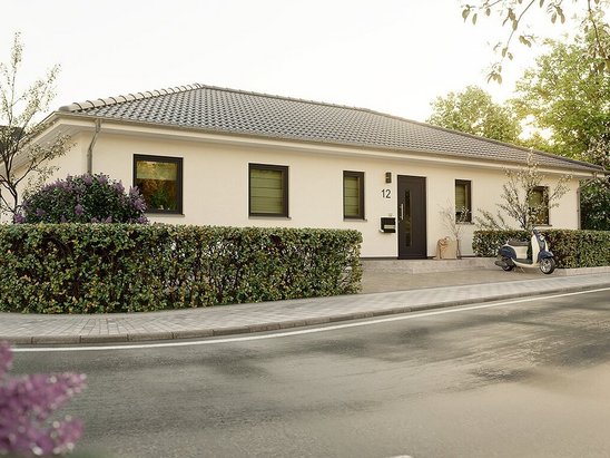 Der Bungalow 110 bietet auf einer Ebene viel Platz für die ganze Familie – mit hellem Wohnbereich, 3 Schlafzimmern und direktem Gartenzugang. Das Walmdach verleiht Charakter. Jetzt anfragen und stufenlos wohnen!